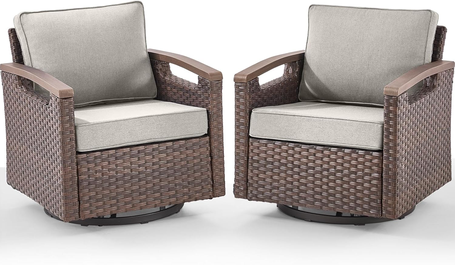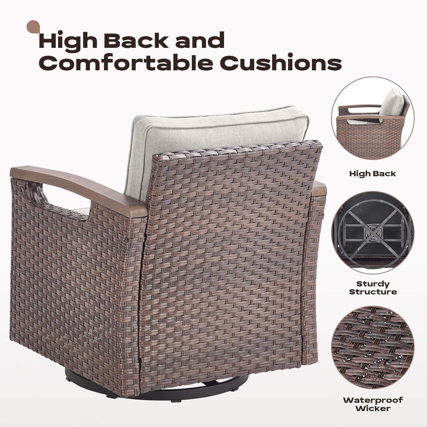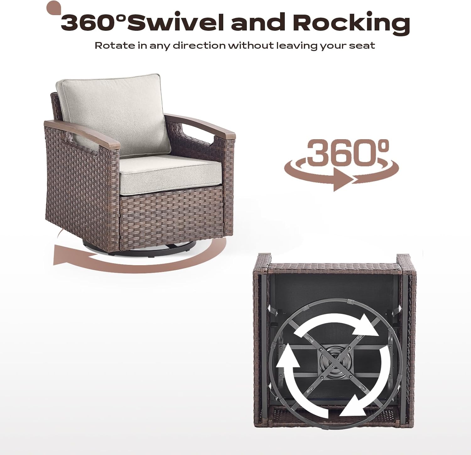 Outdoor Patio Swivel Rocking Chairs Set of 2, All Weather Wicker, Metal Armrest, Deep Seating, Thick Comfortable Cushions, Ideal for Deck Porch Backyard, Brown/Beige