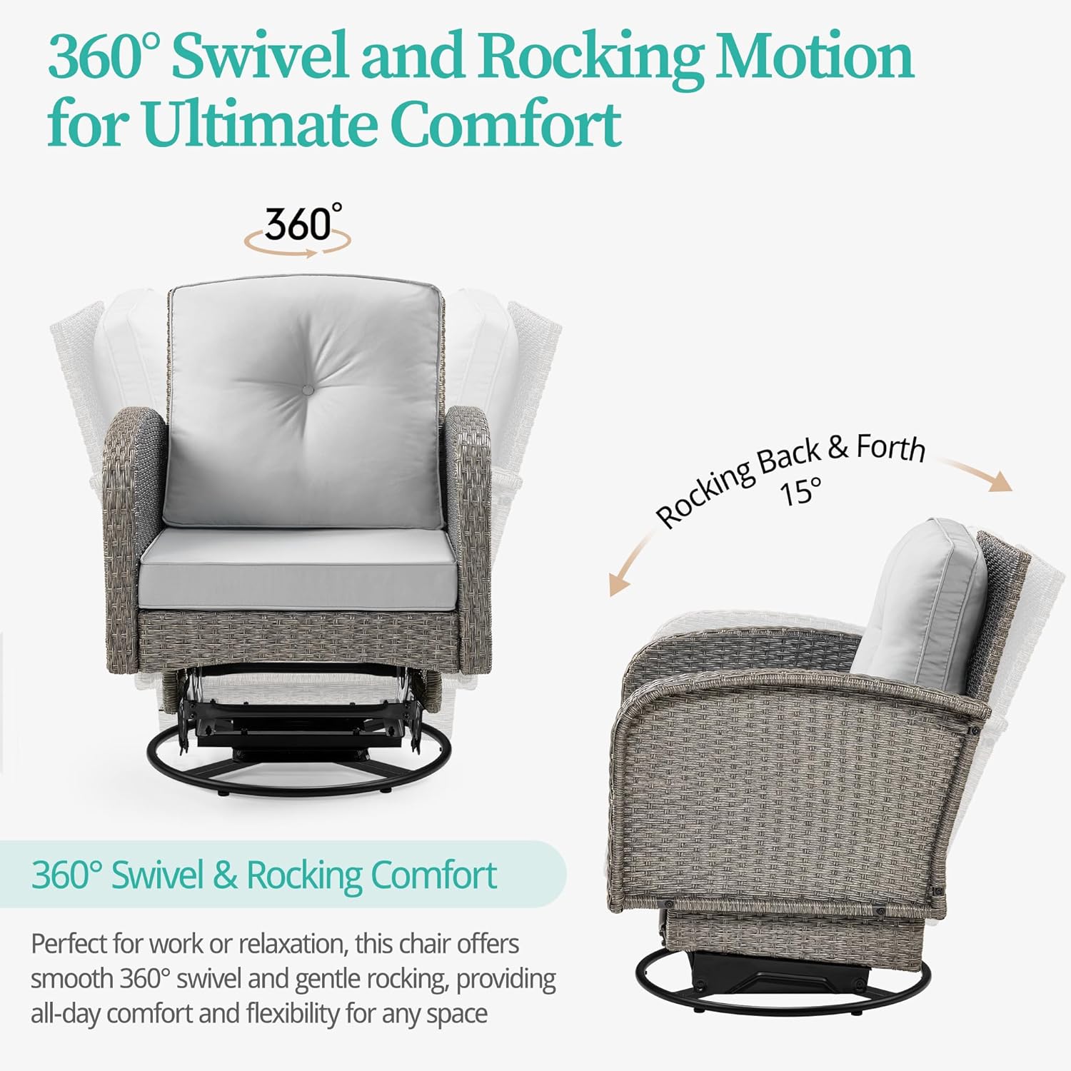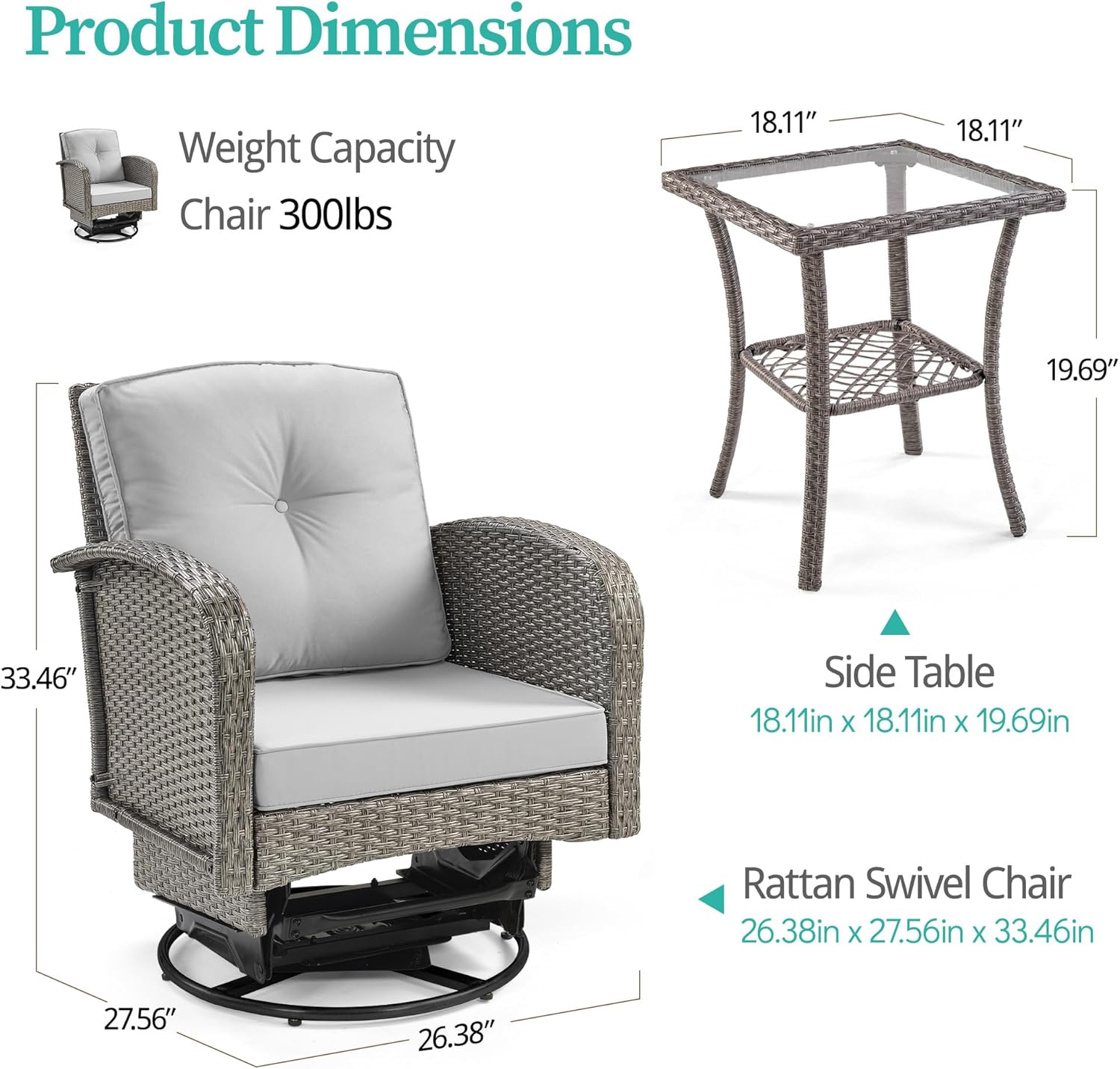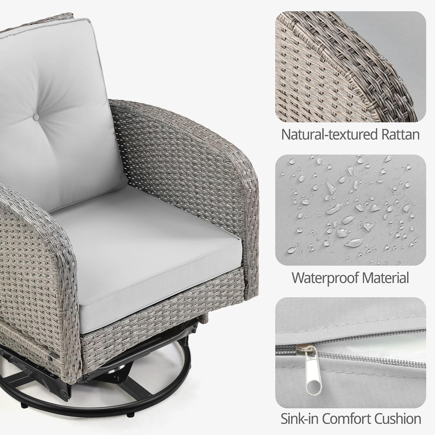 Outdoor Swivel Rocker Chairs Set, 3 Piece Patio Swivel Chairs Furniture Set, All-Weather Wicker Bistro Set, Washable Cushions, Ideal for Porch, Deck, Balcony, Backyard (LightGray)