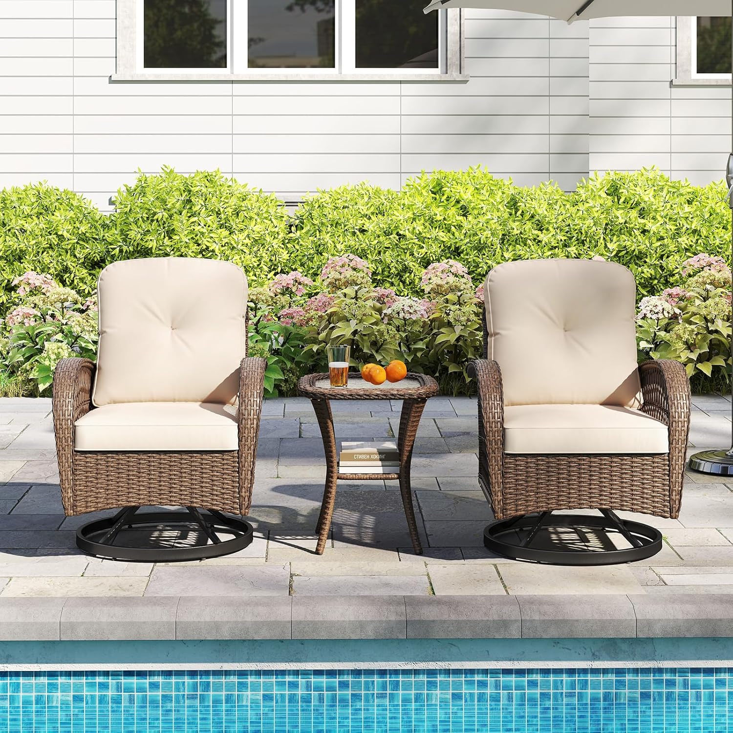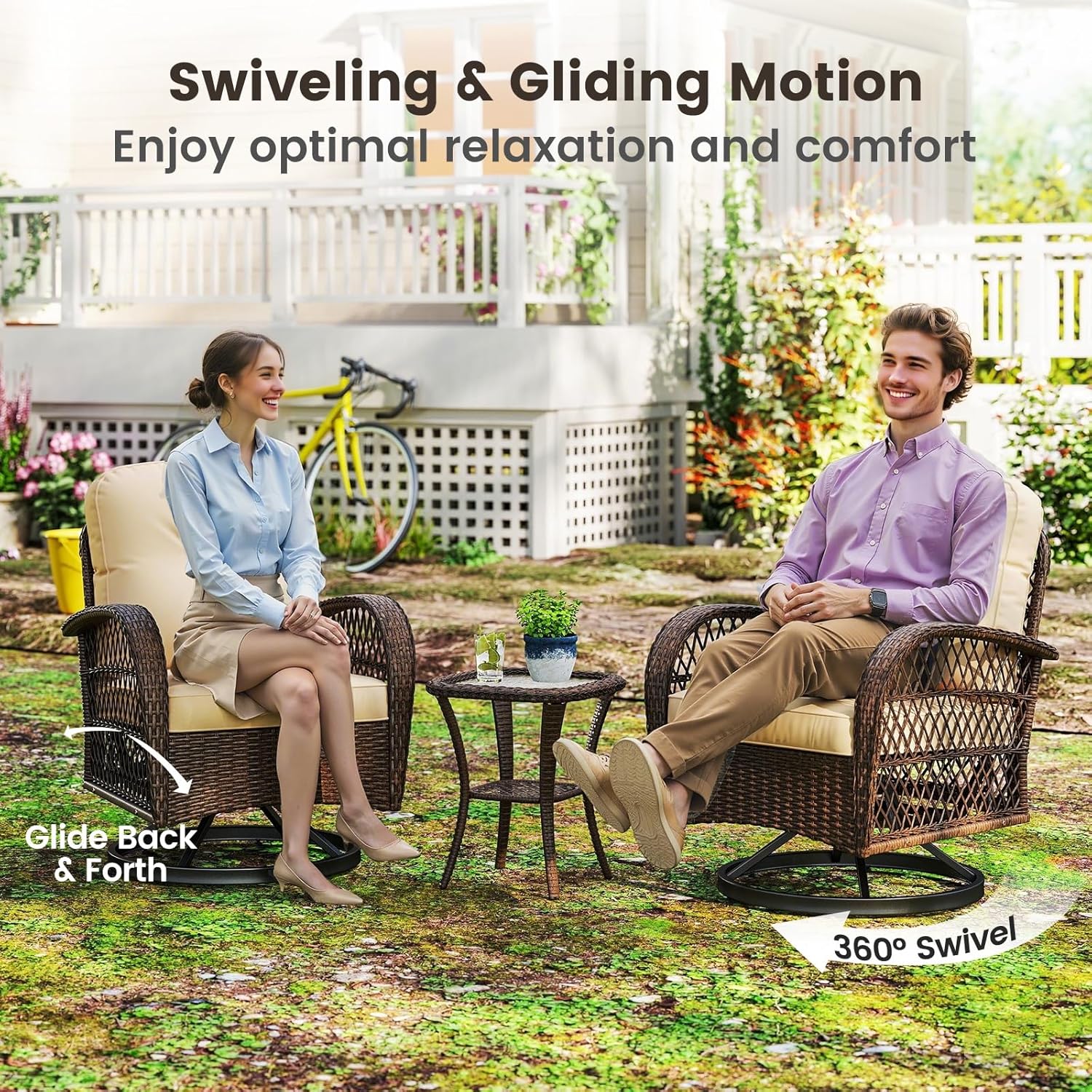 This rocking and swiveling set includes 2rockers that not only swivel 360° but also glide smoothly, featuring curved armrests for added relaxation. Each chair is adorned with thick cushions, ensuring supreme comfort, while the zippered covers of seat cushions allow for easy maintenance. The charm of the patio furniture set is further elevated by a stylish side table with a ripple-like tempered glass top and a wicker shelf. Perfect for your porch, yard, or poolside, this swivel rocker set with well-crafted details promises a stunning blend of elegance and comfort, making it the ultimate choice for relaxation and enjoyment in any outdoor setting.